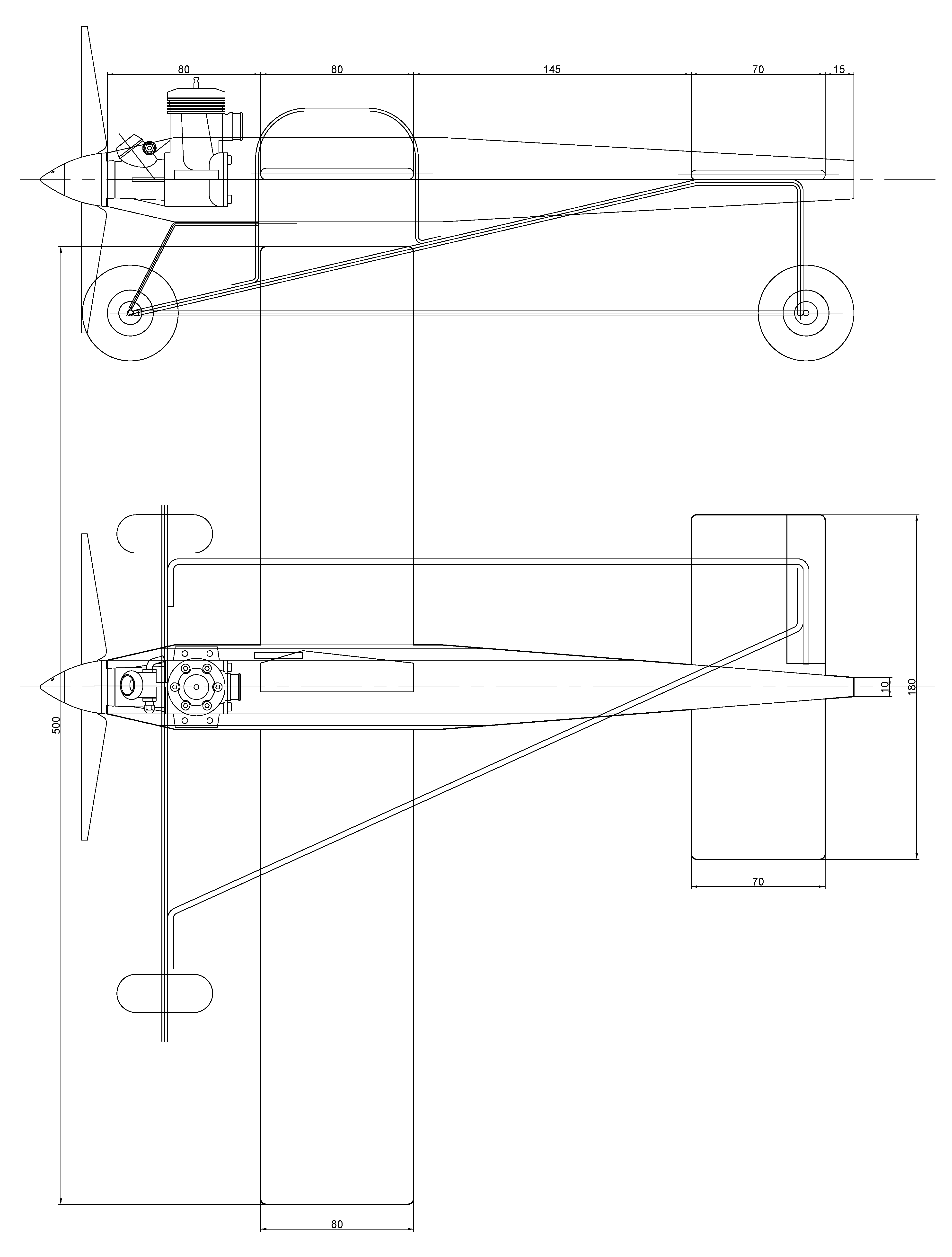 (v návrhu trupu čárkovaně) postačí klasická. Je důležité, aby byla vyšší a úzká. Za letu se totiž vlivem odstředivé síly hladina paliva vychyluje, což může být u širší nádrže příčinou nerovnoměrného chodu motoru. Vývod paliva musí být jako u všech upoutaných modelů na opačné straně, než jsou řídící dráty.
