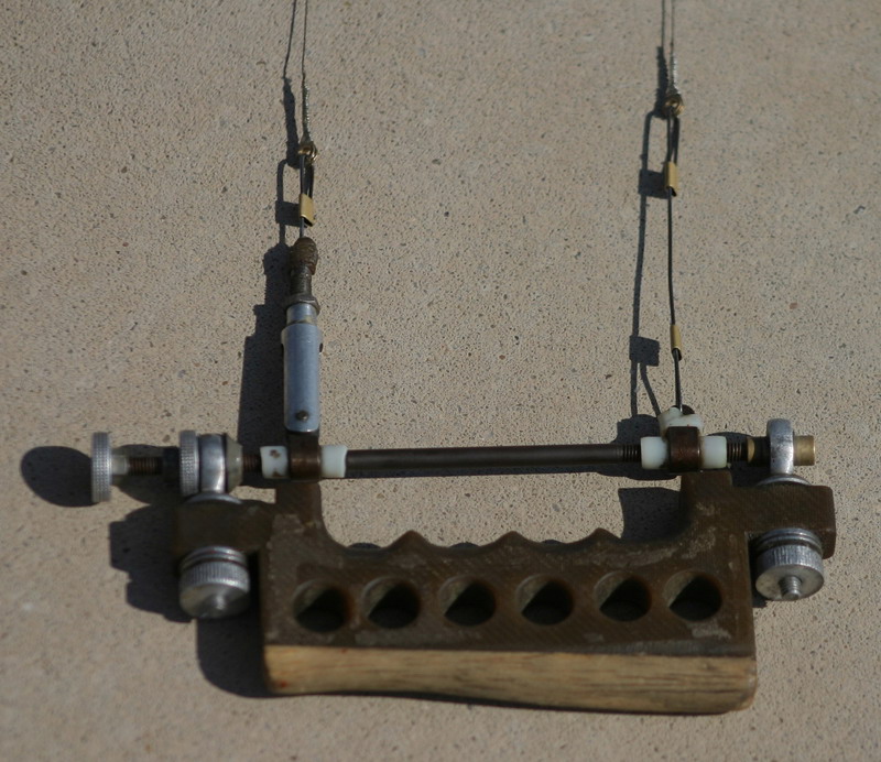 Na obrázku 2 je rukoväť, ktorej rám je zohnutý z duralového plechu hrúbky 2 mm, držadlo je vyrobené buď z tvrdej balzy, alebo lipy (môže byť preglejka), hrúbky aspoň 8 mm. V strede prednej strany je vyvŕtaný otvor pre takzvanú vrátovú skrutku, do ktorej je jesne u hlavičky vyvŕtany otvor na lanko, o priemere 1,6 mm. Lanko je prevlečené jednak týmto otvorom a jednak otvormi v čele, ktoré majú priemer tiež 1,6 mm a rozostup 100 mm. Na konci lanka sú prispájkované dve karabínky o priemere 1,5 mm. Vrátová skrutka je z prednej strany čela dotiahnutá matkou, pričom po povolení je možné dolďovať neutrálnu polohu kormidla.